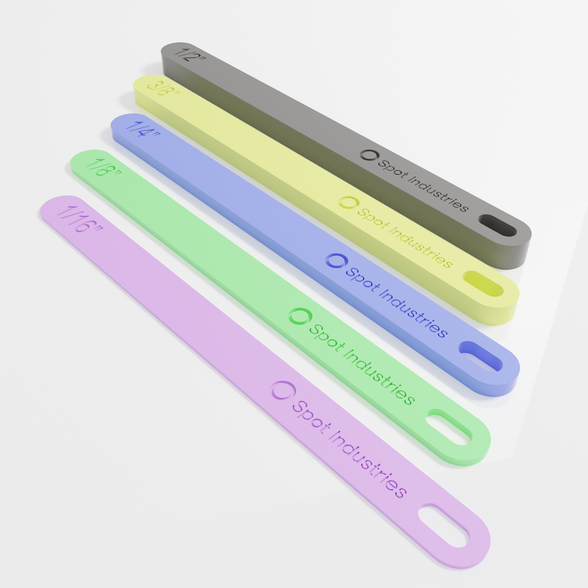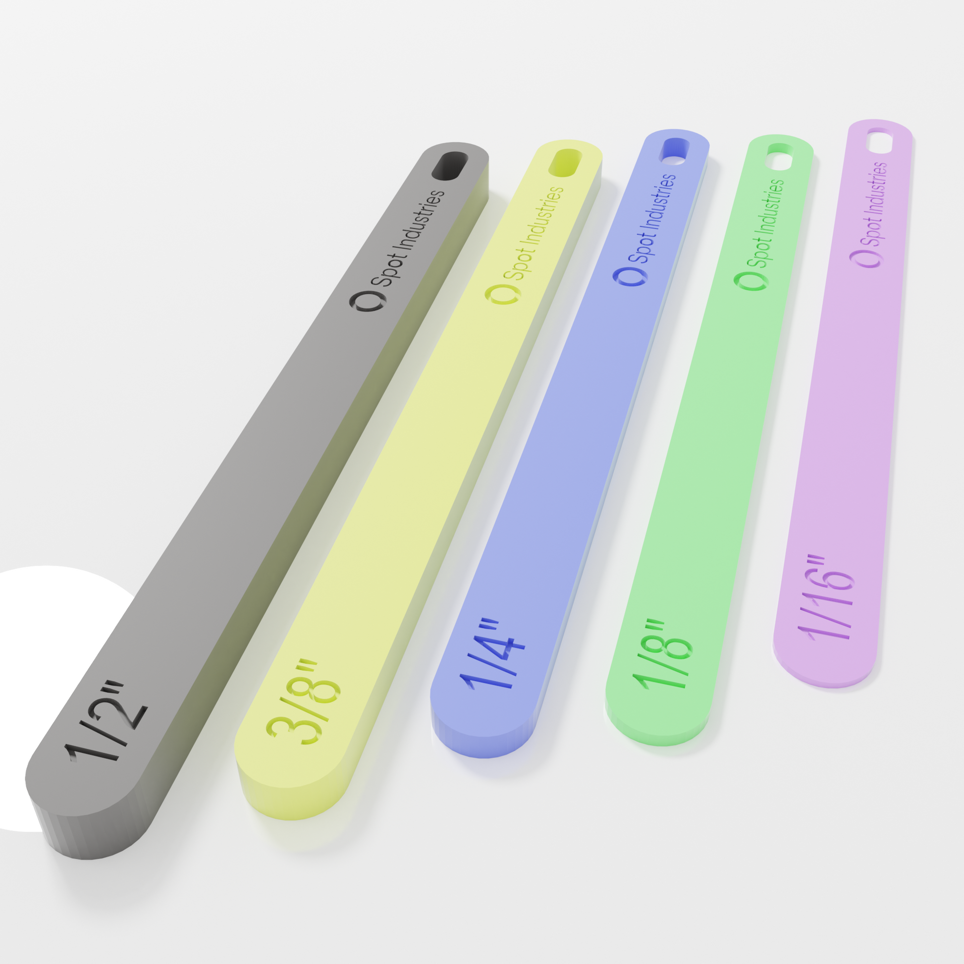Each stick measures 9.5" x .75" and comes in six heights: 1/16", 1/8", 1/4", 3/8", 1/2", 5/8". Each pair contains two sticks of the same dimensions.